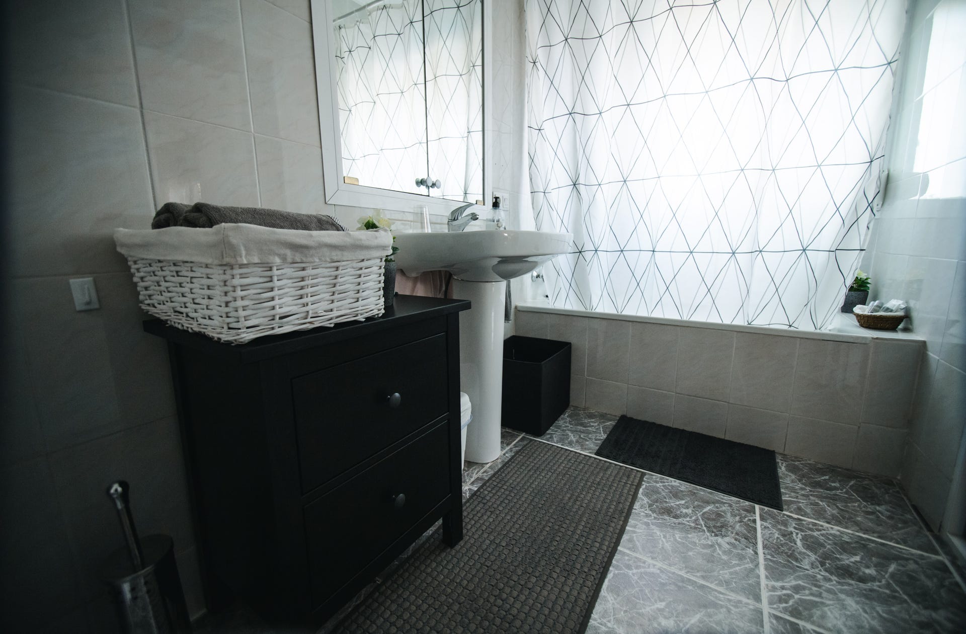 Badkamer met bad/douche, toilet en wastafel